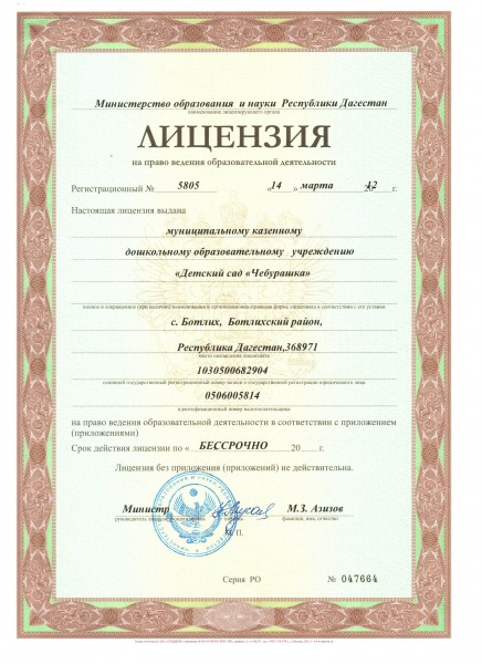| Полное наименование образовательной организации* | Муниципальное казенное дошкольное образовательное учреждение "Детский сад "Чебурашка" с.Ботлих муниципального района "Ботлихский район" |